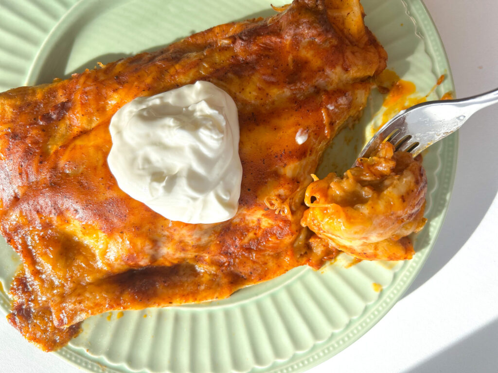 These enchiladas need flour tortillas. The way they soak up the sauce, the way they soften and hold everything together, and honestly the way the leftovers taste the next day (arguably even better) it just doesn’t work the same with grain-free tortillas. I’ve tried. It’s not it.